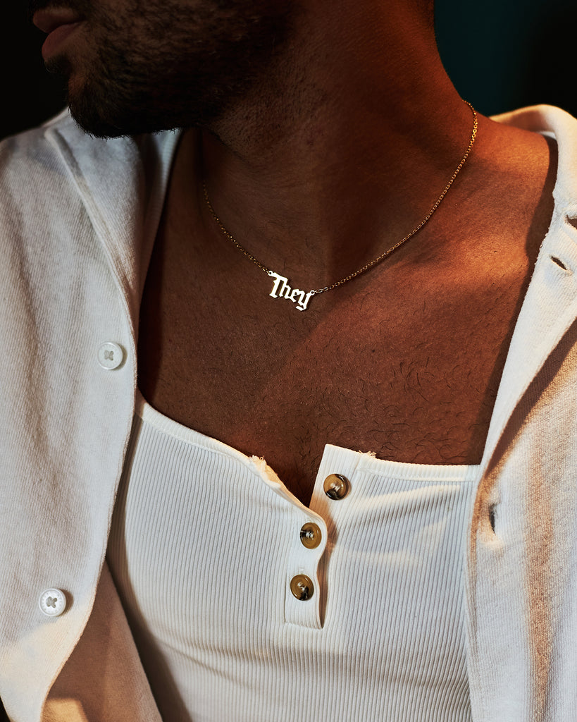 Part of our Pronouns Collection, this necklace is made from 18KT Gold Vermeil and comes in two sizes: